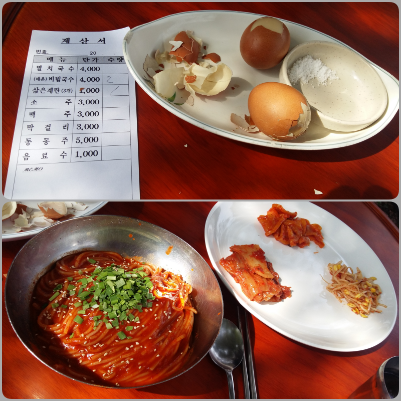 메뉴가 정말 간단합니다. 멸치국수와 비빔국수, 삶은 계란입니다. 우리는 남자 2명이니 비빔국수 2개와 삶은 계란 3개를 주문했습니다. 그렇게 주문해도 9000원밖에 안되네요.